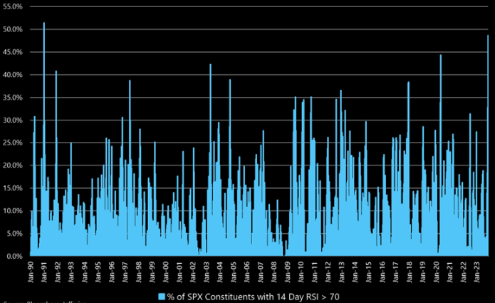 根据 14 天 RSI 来看,标准普尔 500 指数中有 49% 的股票被认为是超买(>70)。SPX 里超过 50% 的股票过热是很罕见的。自 1990 年以来,这种情况只发生过一次。这种情况可能受到不少市场止损盘推动。通常也标志着市场的一个转折点,市场可能进入冷却期: