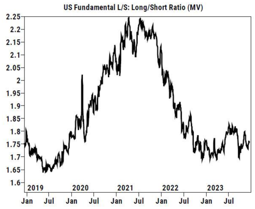 高盛客户交易数据,上周总杠杆率上升 2.4 个百分点,至 199.1%(三年历史里第 100 百分位 ),净杠杆率上升 0.9 个百分点,至 54.6%( 48 百分位)多头 / 空头总体比率上涨 0.2%,至 1.755(25 百分位):