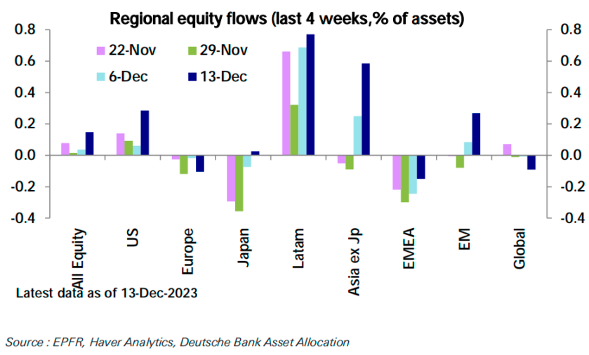 流入股票基金的资金(253 亿美元)也飙升至近 21 个月以来的最高点,其中以美国(259 亿美元)为首,增长比例最大则是新兴市国家股市: