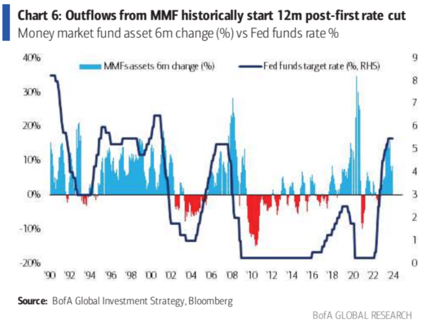 自 1990 年以来,货币市场基金的资金流出平均在第一次降息后的 12 个月开始,如果这一趋势持续,那么资金流出将从 2025 年第一季度开始。