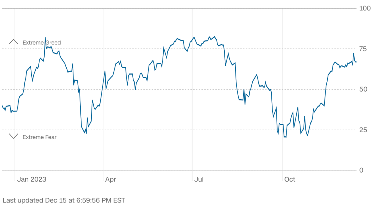 CNN 恐惧贪婪指数小幅走高,位于>70 贪婪区间,但未触及极度贪婪