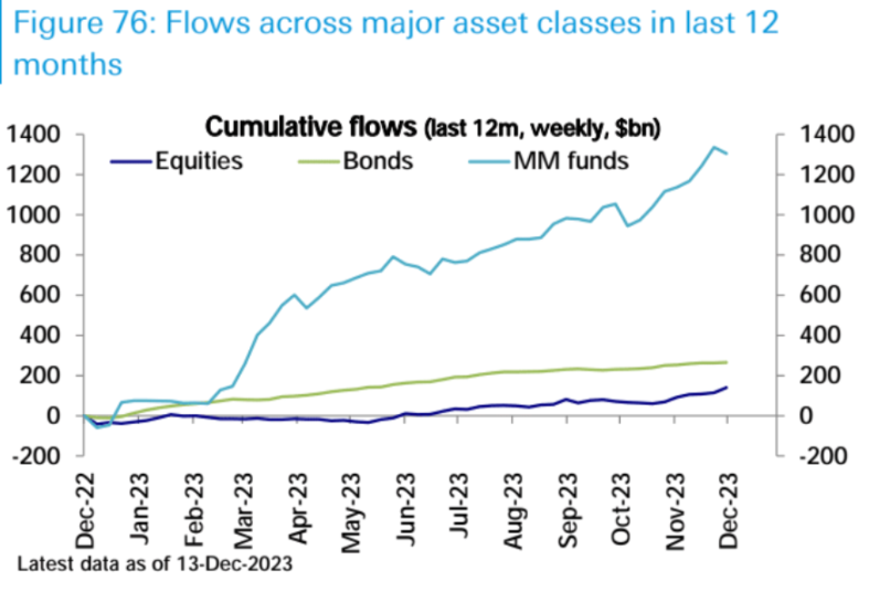 货币市场基金资产在还没到季度纳税日之前就从历史高位下跌,可能预示着资金流将发生转向,因为明年降息的前景促使投资者寻求其他资产的更高回报。