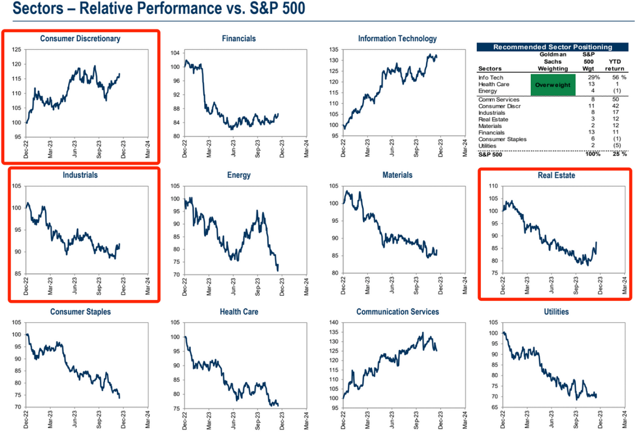 各大机构在会后也纷纷调降美债收益率曲线预测,对 10Y 美债 24 年底预测值巴克莱是从 4.5% 降至 4.35%,高盛是从 4.3% 降至 4%,摩根大通是从 4.3% 降至 3.65%。我们还看到了高盛直接把 SPX 明年底目标价大幅上调 8% 至 5100