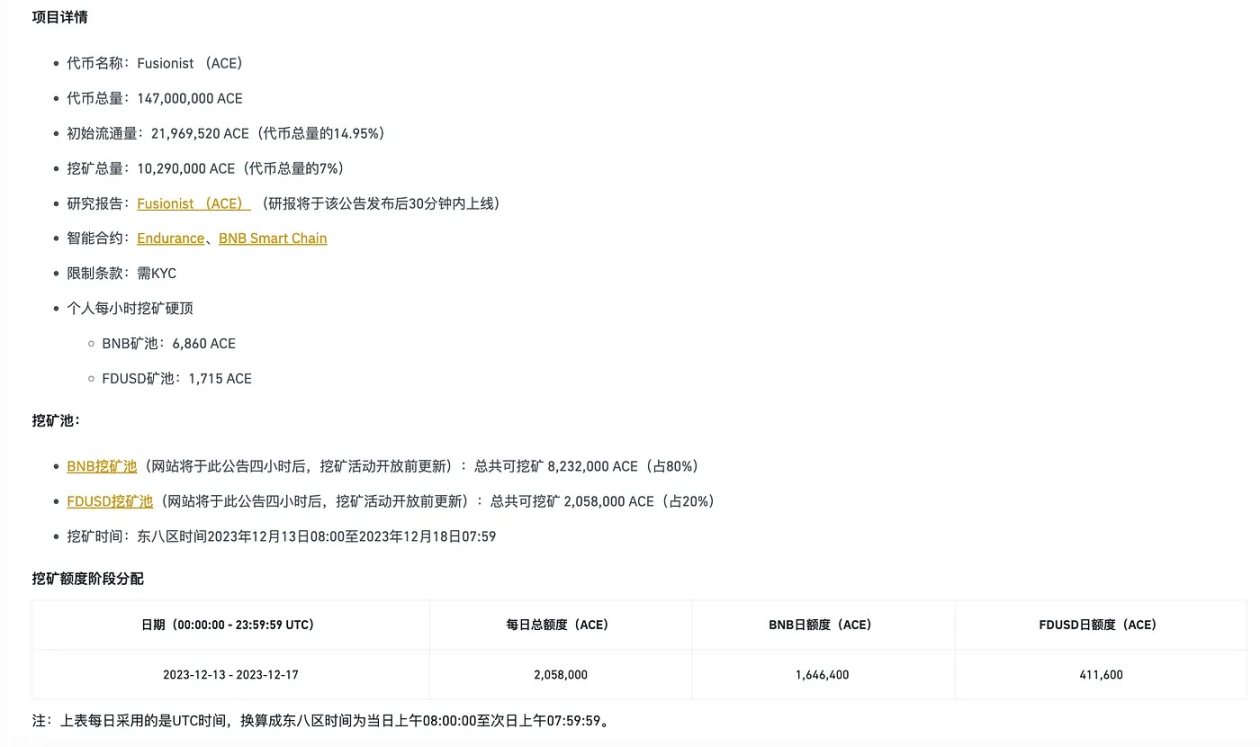 12 月 18 日,Binance 宣布将上架太空机甲风游戏 Fusionist 代币 $ACE,并且会同步支持 $ACE 的自研链 Endurance 和自家的 BNB Smart Chain,与此同时,Binance 还开放了 $BNB 和 $FDUSD 的奖励池。