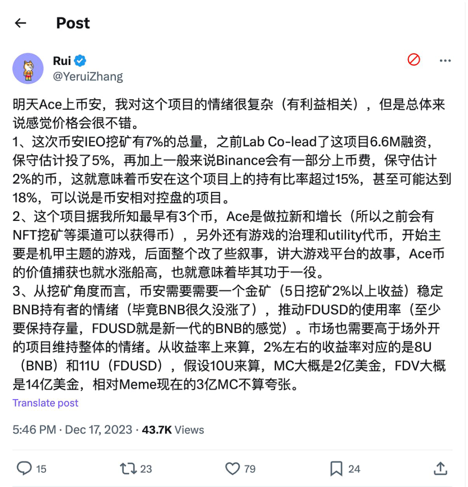 结合@YeruiZhang 在 X.com 的发文,笔者认为:考虑到 Binance 面临的外部环境(调查和竞争),此时推出并上架参投项目代币是一种主动的策略选择。一旦 $ACE 表现优秀,既可以进一步推动对 $BNB 和 $FDUSD 的赋能,还可以因此大大增强市场的信心和用户的信心,毕竟除了行业的不断声援,最终还是要落在平台营运能力和用户活跃的相关层面。