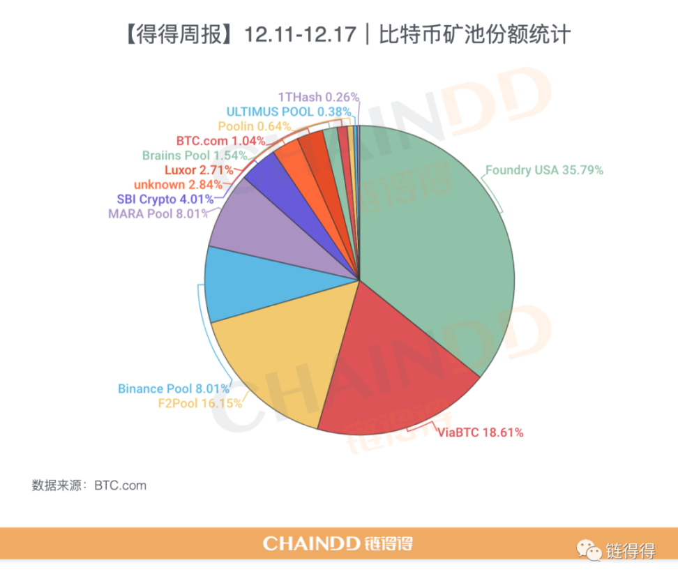 本周比特币矿池中份额无明显波动据得得智库统计,本周比特币共出区块 1058 块。其中空块数量 9 块,空块占比 0.85%。平均矿工费与块奖励占比 33.07%。本周比特币 TOP 10 矿池份额占总份额的 98.30%,具体矿池份额分布如下:
