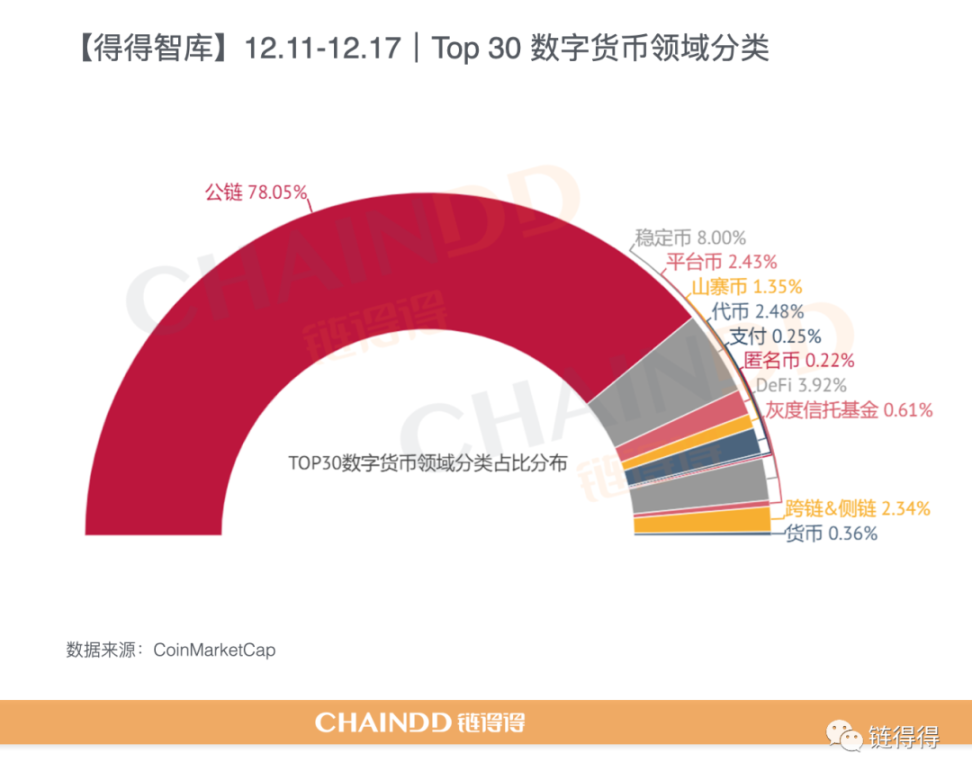 本周市值 TOP 30 的数字货币分为公链、平台币、稳定币、代币、DeFi 等领域。其中占比最多的领域是公链,占比为 78.05%,排名第二的领域是稳定币,占比为 8.00%。TOP 30 数字货币领域分类的占比分布如下图所示:
