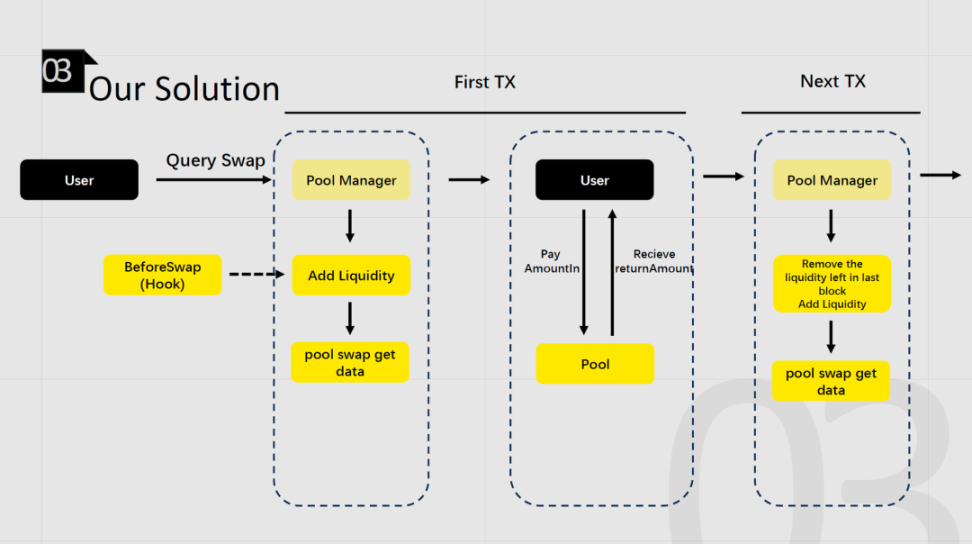 创新之处在于处理后续交易。在下一笔交易启动前,BeforeSwap 钩子再次被触发。它的首要任务是移除上一笔交易遗留的任何多余流动性。