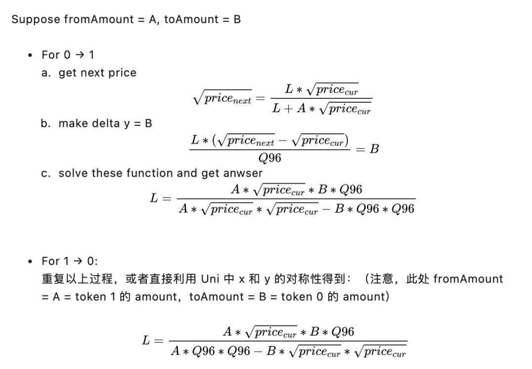 Uni V4 和 Uni V3 计算公式是一致的,尽管 Uni V4 的 pool 变成了一个 lib。我们仅考虑在一个极小的 tick 间隔内填充单边流动性,例如 tick -46874 与 tick -46873 之间填充流动性,以尽量减少跨 tick 消耗。阅读代码和相关的解析文章可以利用 Uni 的算法得到以下公式。