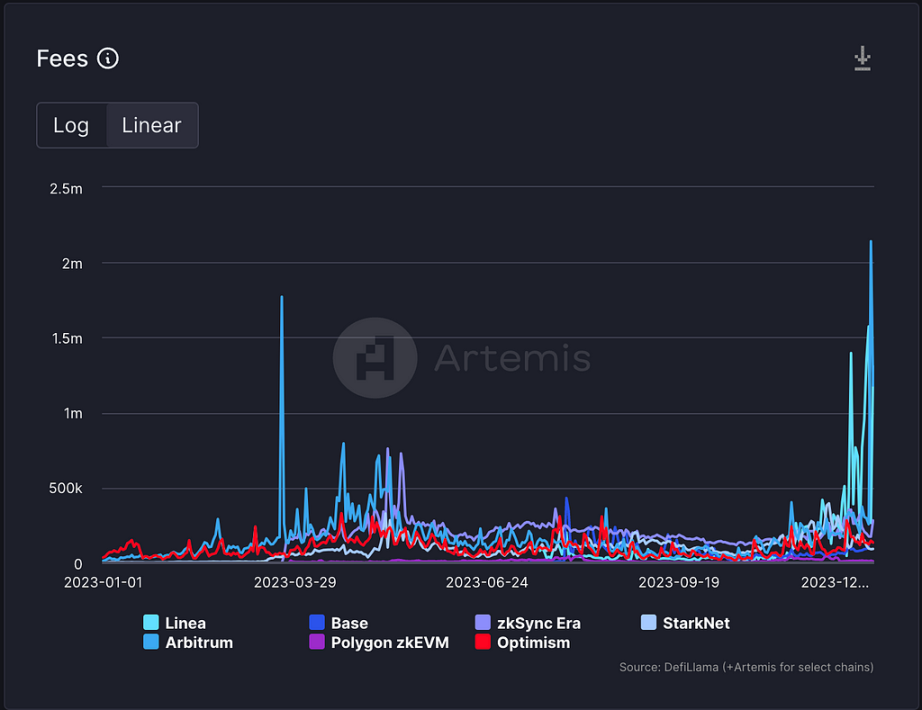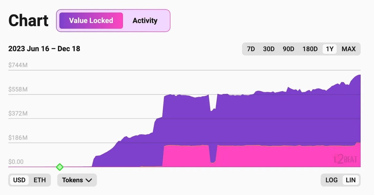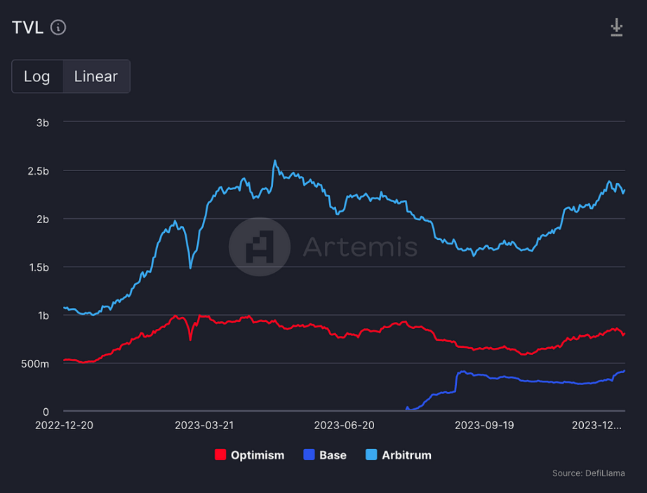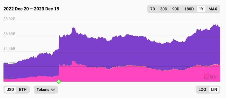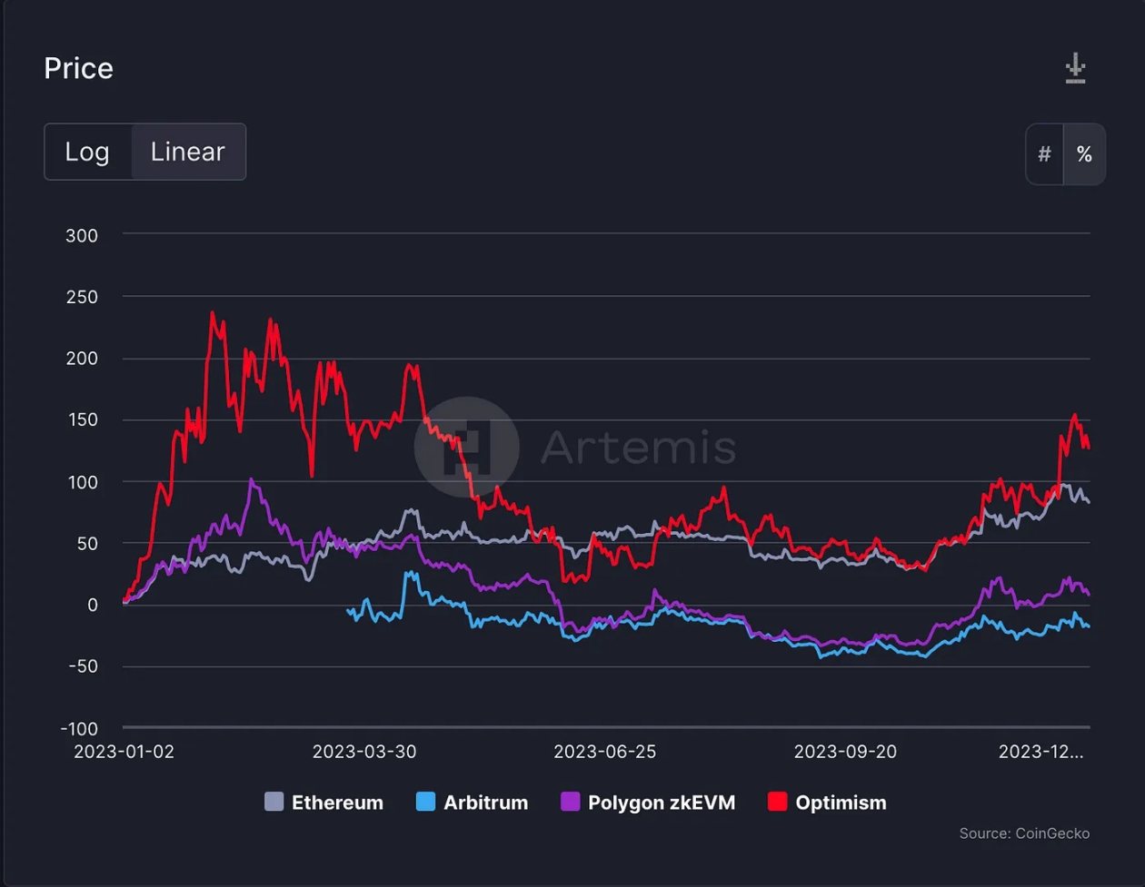 虽然 2023 年 12 月 09 日 Arbitrum TVL 达到了历史新高的 84.8 亿美元,但它的市场占有率一直在下降,主要原因是 OP 的强势上升以及多个 Layer2 主网上线的稀释。OP 的 20 亿美元流通市值也超过 Arbitrum 的 13 亿美元流通市值,而全流通市值方面 OP 仅仅比 ARB 少 10 亿左右,市场对于 OP 的未来看好程度高于 Arbitrum,对其定价也略高。