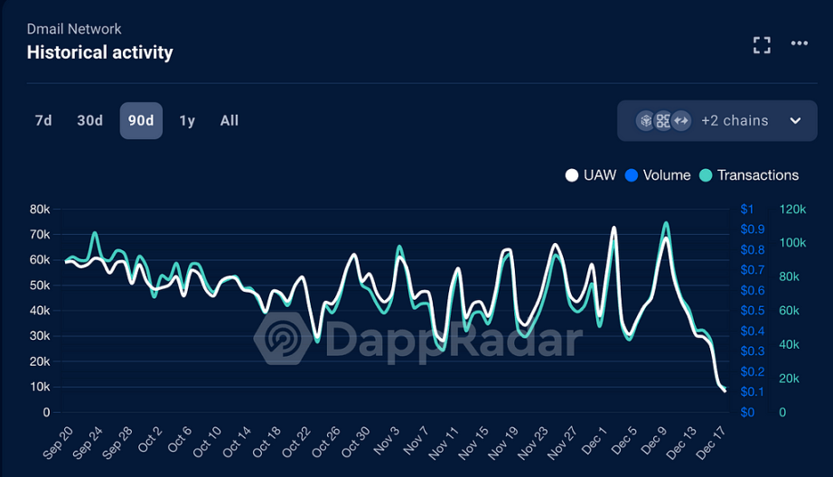 Dmail Network 是 zkSync 上邮箱相关的应用,曾经获得 ETH 黑客松一等奖。目前 Dmail Network UAW 主要是空投预期带来的交互次数提升。