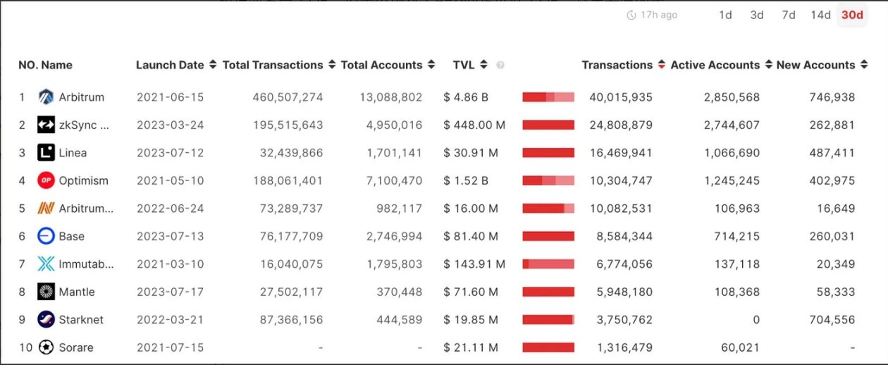 市场份额 Top10,Op Rollups 系的 Optimism、Arbitrum 占据了 80% 以上份额,相比起来 Zk Rollups 系略显不足,但是做为 Layer2 生态的重要组成和备受瞩目的潜力方案,Zk Rollups 与 Op Rollups 在竞争中各自发展并相互借鉴,下面我们结合目前的市场表现,选择 Arbitrum、Optimism、Base、zkSync、StarkNet 和 Linea 作为目标就习惯详细解读: