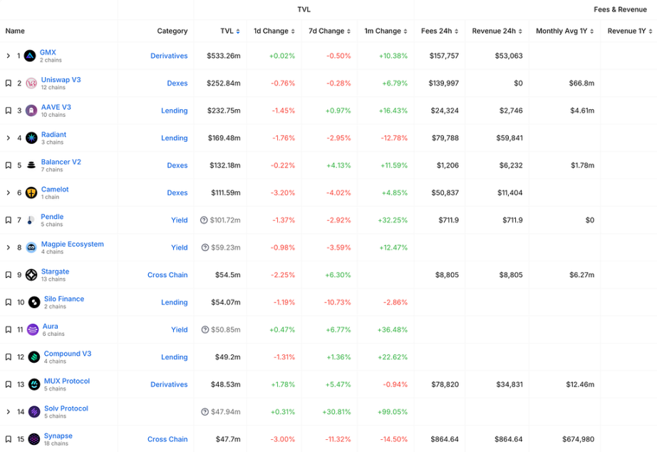 Arbitrum 生态的在 DEFI 类别中,包括了 GMX、Radiant Capital、Camelot,但 Arbitrum 的 DeFi 生态更加具有生态独特性,许多 DeFi 项目均是基于 GMX 流动性池进行搭建。