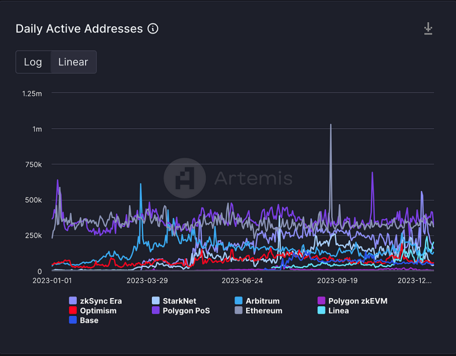 近三个月,zksync Era 的总活跃地址数保持较为稳定,平均每日活跃地址数在 20 万左右;而 Arbitrum 和 OP 这种发币后,Arbitrum 维持在每日 15 万左右,OP 维持在每日 6 万左右。我们看到 Arbitrum 的生态粘性显著高于 OP,但是市场对于 ARB 的定价低于 OP,其主要原因是: