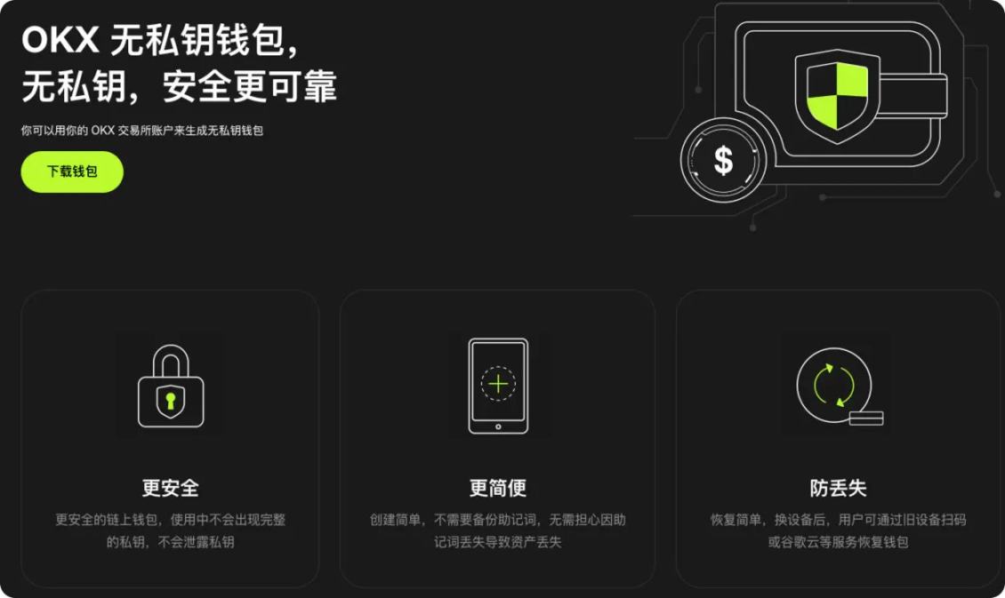 再次, OKX Wallet 强调创新, 积极拥抱前沿技术。其今年推出基于账户抽象协议 (EIP-4337) 的智能合约账户, 可恢复的特性将大大提高钱包的安全管理能力; 而其上线的 MPC 无私钥钱包, 则利用多方安全计算技术, 减少了单点故障造成的私钥安全风险, 让用户无惧私钥丢失。