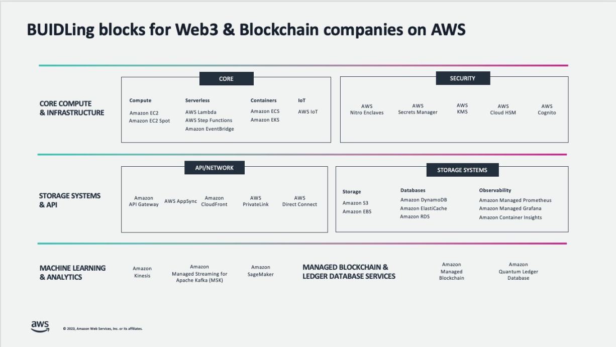 从服务类别来说, AWS 是全球广泛采用的云平台, 提供超过 200 个功能丰富的服务, 包括分布在全球的数据中心, 可以满足各类 Web3 公司独特的基础设施需求。AWS 服务了众多的 Web3 项目, 大家最广泛使用的七个 AWS 服务包括: EC2(Nitro Enclaves)、KMS/CloudHSM、API Gateway、S3、Elastic Block Store、Shield Advanced、WAF。