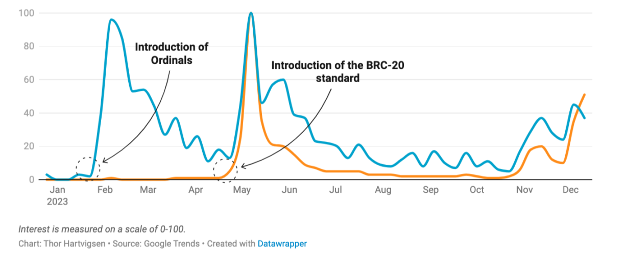 在过去 12 个月中,「BRC-20」和「btc ordinals 」在全球范围内的谷歌搜索流行度。