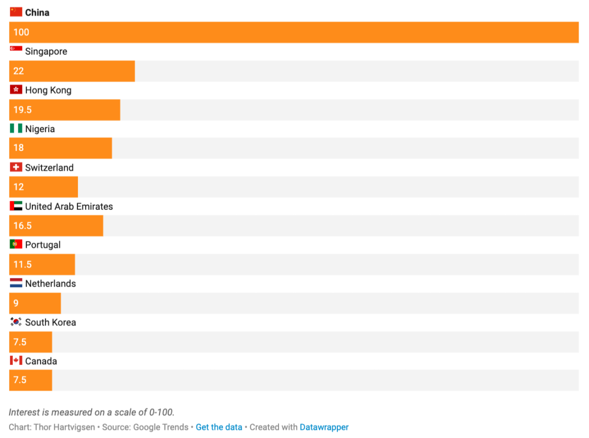 来自各种网络社区的轶事证据和搜索引擎的数据表明,这些趋势的爆发主要发生在中国。中年人甚至是老奶奶都开始学习如何购买和交易 BRC-20 代币。