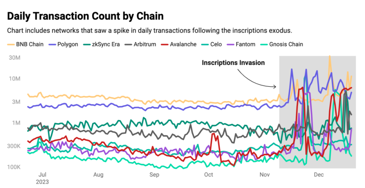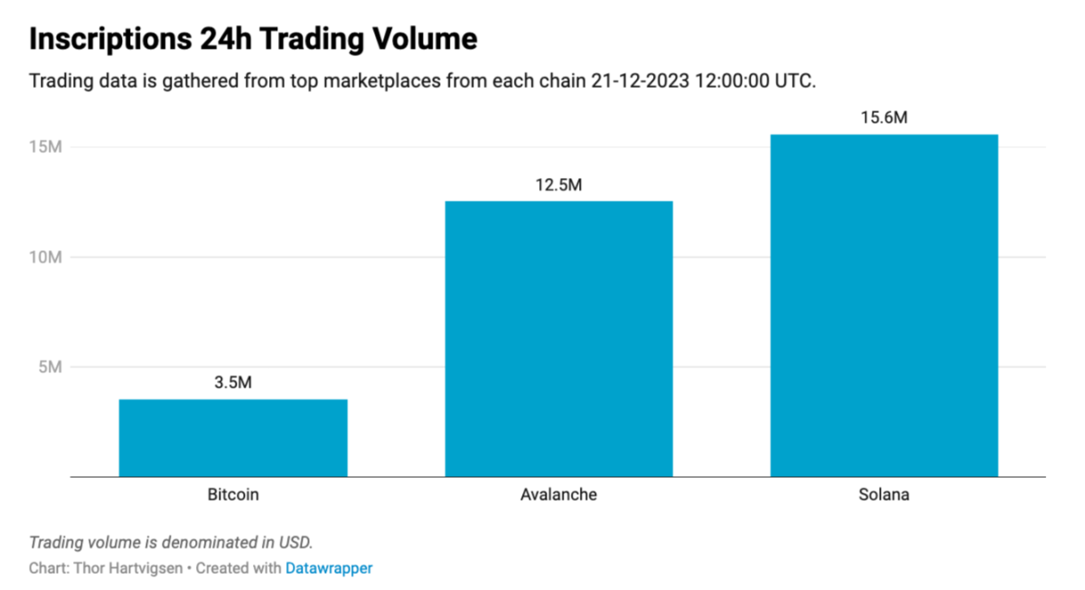 铭文在比特币之外的广泛应用是显而易见的,Solana 和 Avalanche 等链在交易量方面完全占领了市场。
