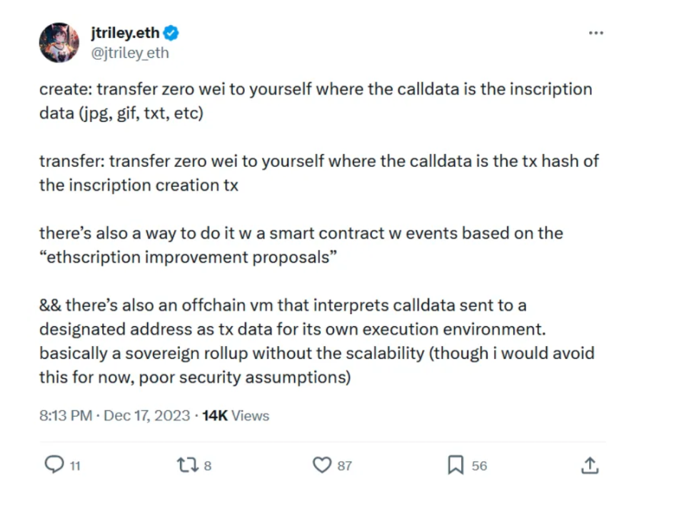 但是,铭文在比特币之外是如何被利用的呢?jtriley.eth 在推特上对这背后的方法进行了翔实的总结: