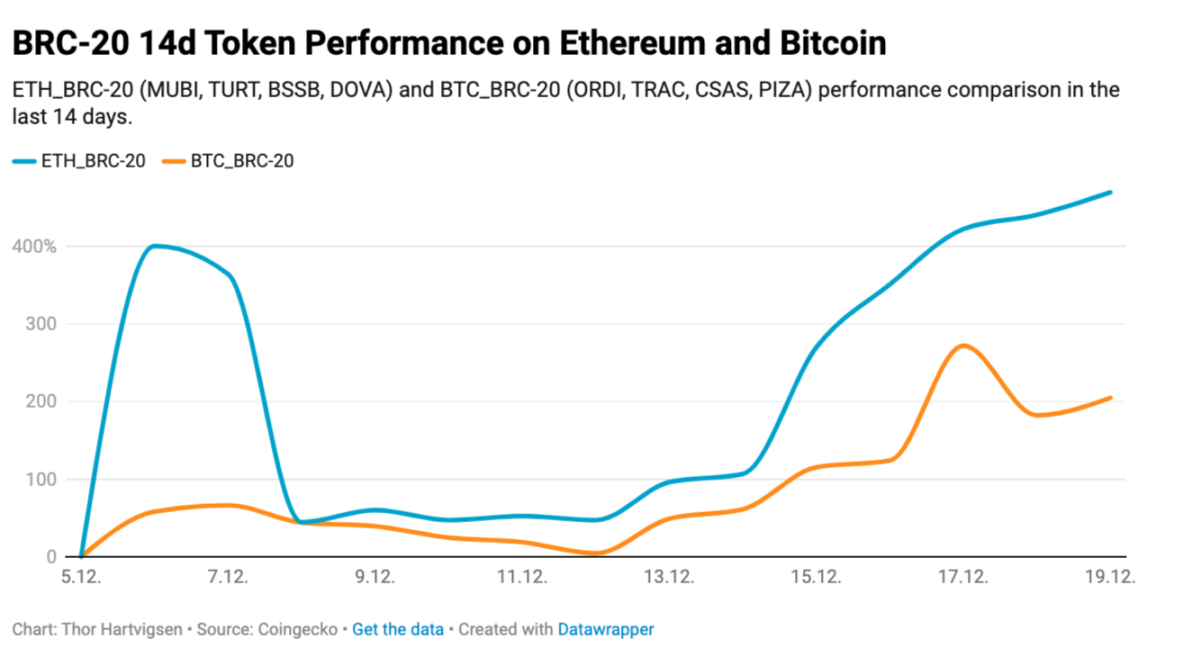 许多 BRC-20 代币通过各种桥进入以太坊,吸引了大量投机者,其中最著名的代币每天都能获得两位数的回报,而比特币的交易活动在反弹一段时间后逐渐降温。