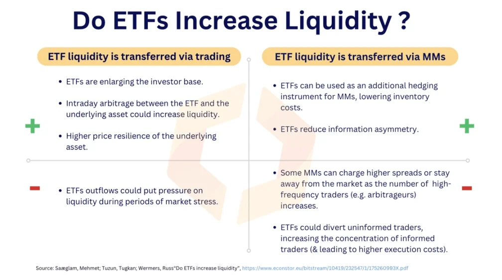 在「ETF 将损害流动性」方面,人们真正担心 ETF 的大量资金外流可能会给基础市场带来抛售压力。在做市商方面,由于消息灵通的交易者数量较多,他们可能会收取更高的点差。