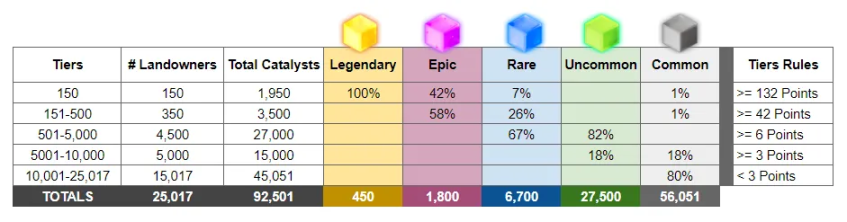 如下表所示,所有 LAND 持有者都有资格领取至少 3 个 CATALYSTS,而排名前 150 的 LAND 持有者则领取了 13 个 CATALYSTS,其中包括顶级 CATALYSTS。这确保了根据每个 LAND 持有者拥有的 LAND 数量和类型进行分配