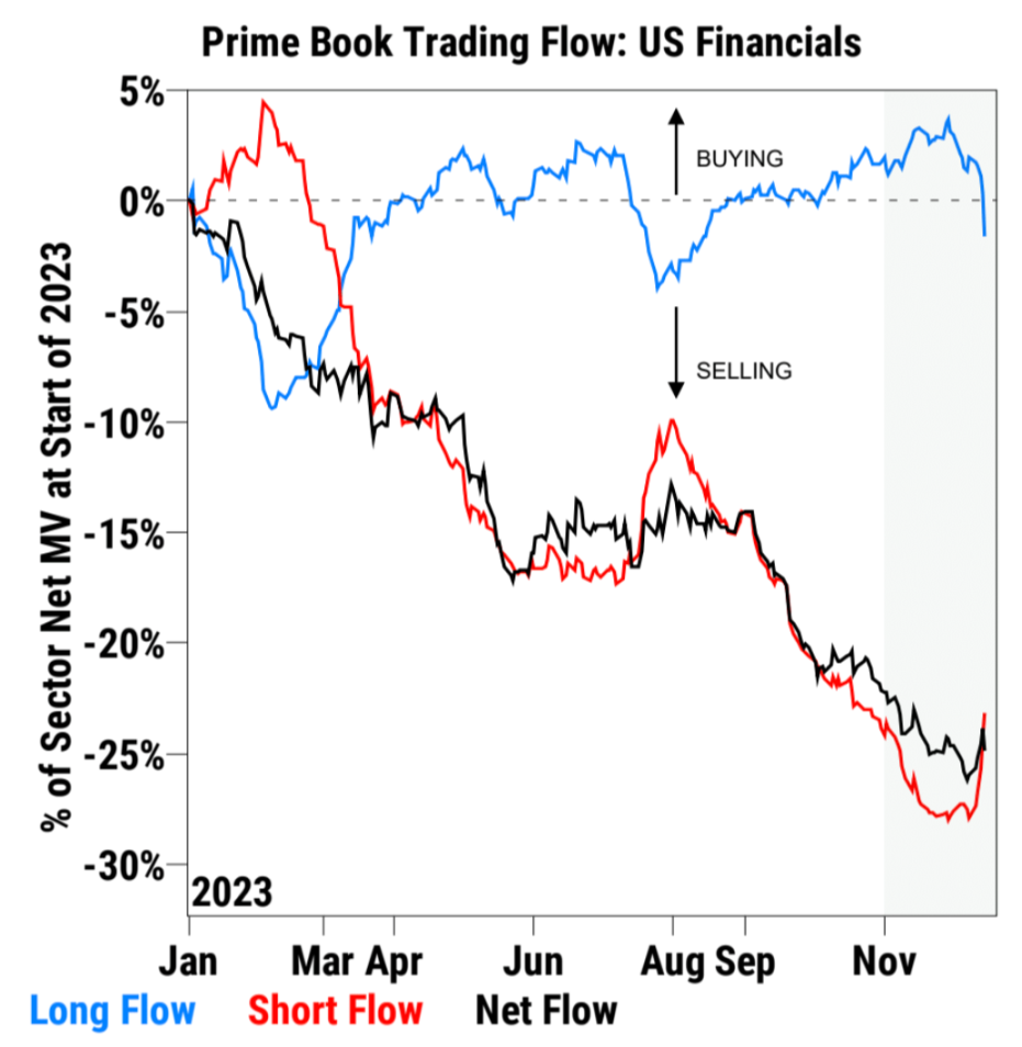 以金融板块为例从 11 月地点反弹了 19%,但多头在上周开始转为卖出: