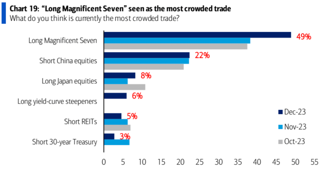 最拥挤的交易头寸是做多“Magnificent 7”(49%) 和做空中国股票 (22%);中国房地产被视为最有可能的系统性信用事件 (29%):