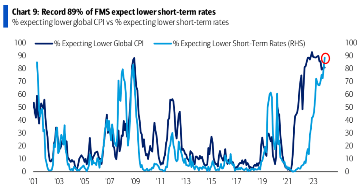 91% 的受访者认为美联储加息周期已经结束;89% 的受访者预计短期利率会下降,这是自 2008 年 11 月以来的最高比例,62% 的受访者预计债券收益率会下降