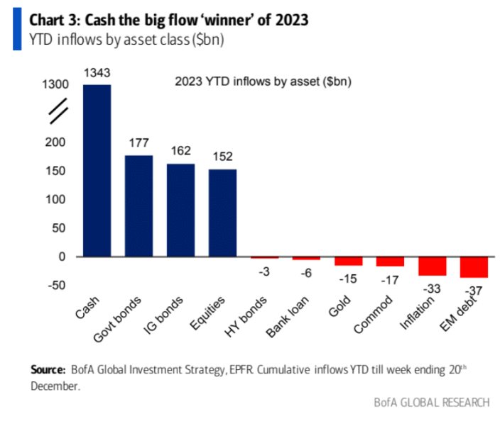 EPFR Global 的数据表示,现金基金吸引了 1.3 万亿美元的资金流入,使流入全球股市的 1,520 亿美元相形见绌。投资者对美国国债的投资也比以往任何时候都多,达到 1,770 亿美元。这些数据说明,在经历了惨淡的 2022 年之后,今年的股市反弹如何让大多数投资者感到意外。这可能意味着,如果央行的预期符合预期,新的一年仍有大量资金在观望,等待被推入股票和债券。