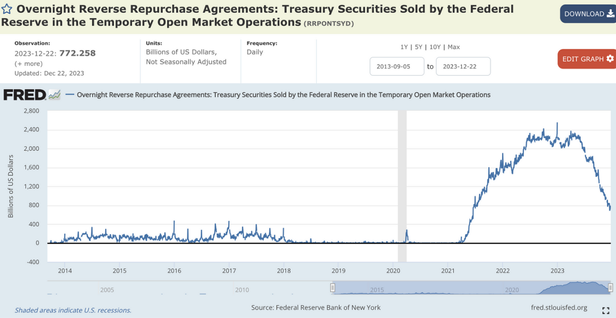 回想起 7~9 月市场担心的财政纪律混乱的主题让股票和债券市场大跌,实际上到了 2024 年也不会有任何好转,只会更差, 2023 年美债的净发行量为 1 万亿美元,但 2024 年将飙升至 1.9 万亿美元,逆回购工具可能会在 3 月份耗尽难以提供更多流动性支撑,这或许是除了通胀之外市场押注联储必须大幅降息的一大背景。