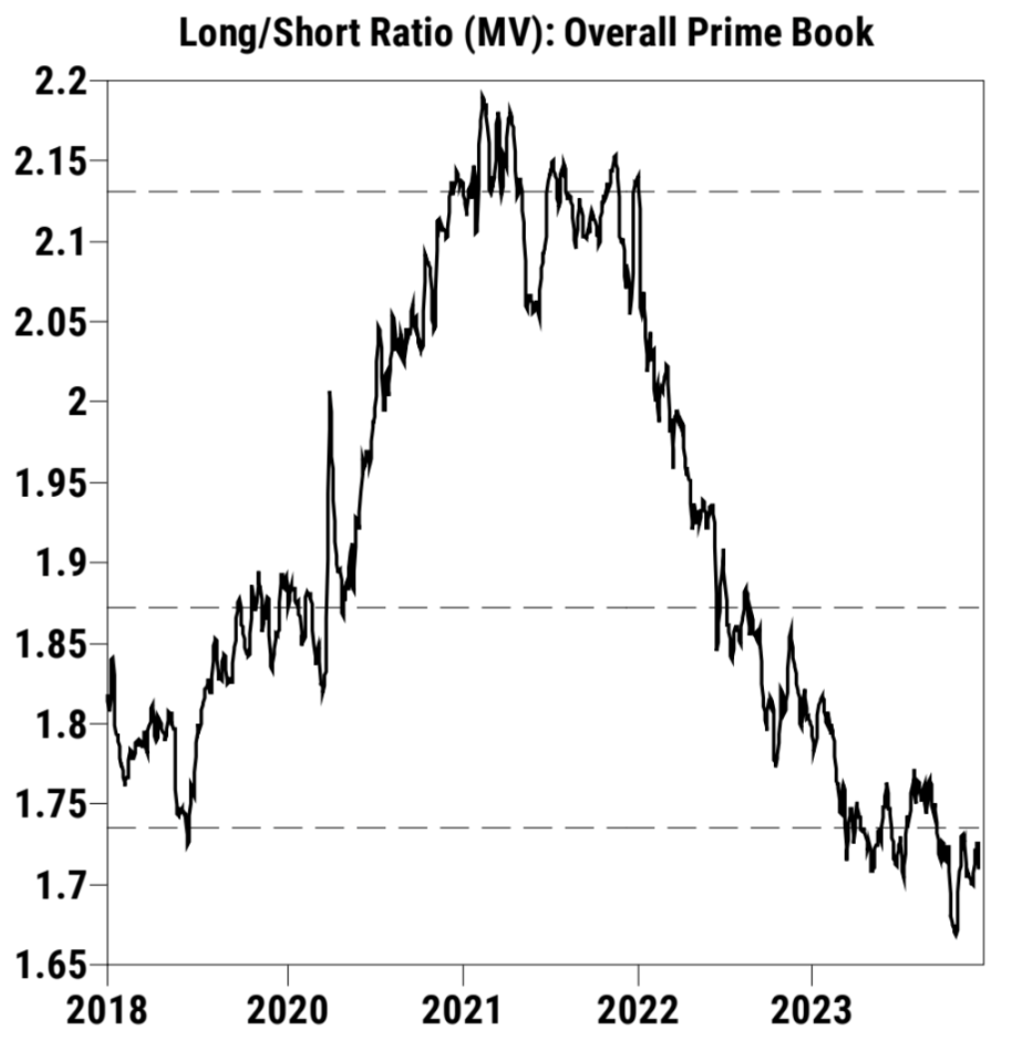 过去两周 GS 对冲基金客户的总杠杆率和净杠杆率都加速爬升