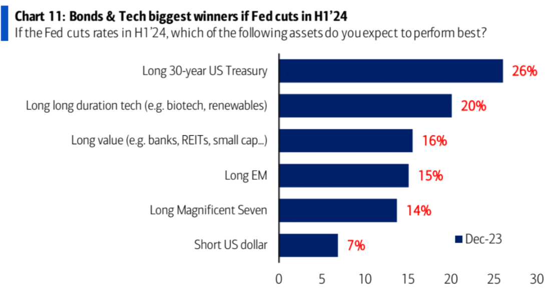 若 Fed 一季度就降息,最看好的交易,首先是长久期国债,其次是长期科技股(例如生物技术,可再生能源),然后是长期价值(例如银行、房地产投资信托基金、小盘股……):
