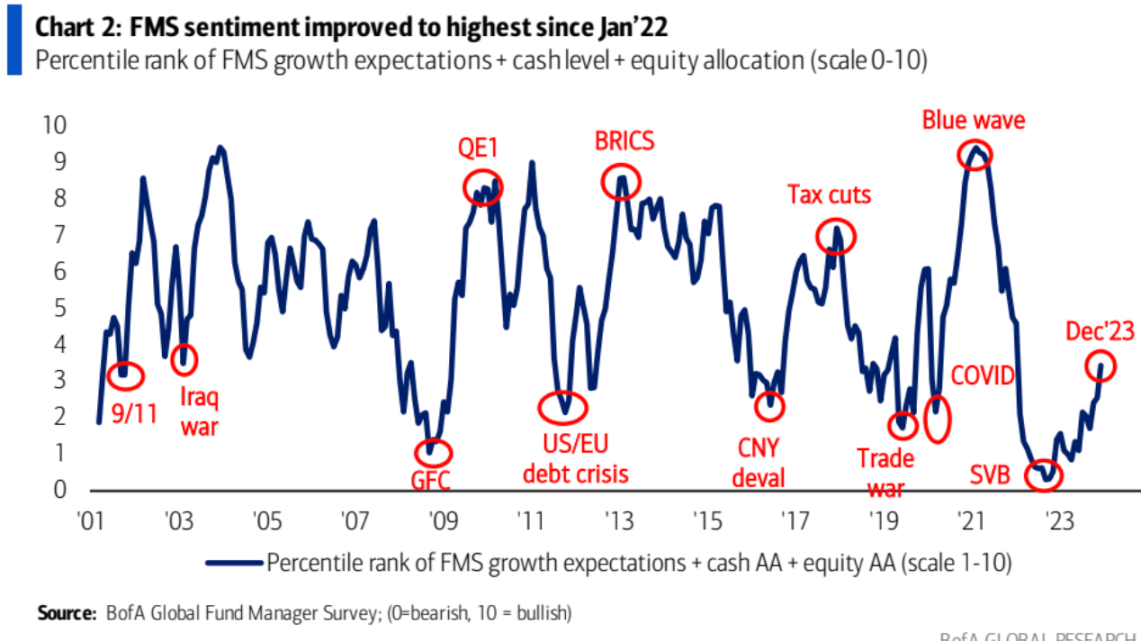 BofA 全球基金经理月度调查显示投资者情绪自 2022 年 1 月以来最为乐观,现金水平降至 4.5%(2 年低点 )