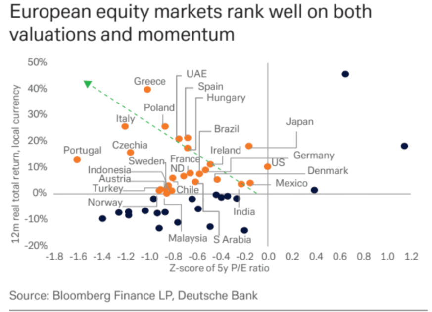 过去五年,在我们分析过程中约占一半市场份额左右的几个欧洲和亚洲国家(粗略计算)的市盈率(P/E)低于过去五年均值 0.75 个标准差。即使在美国和日本,倍数也只是现在才达到其平均水平。如果 2024 年在更确定的宏观经济背景下市场上风险偏好模式持续,很可能会支持便宜的资产。其中许多位于美国以外,它们可以提供多元化收益,并且现在势头也不错: