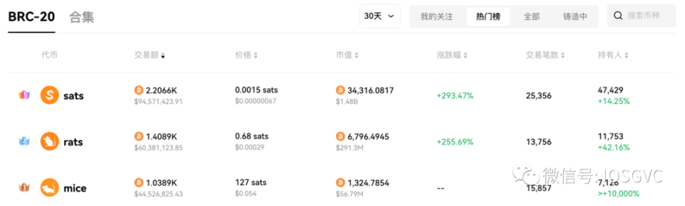 而随着 Binance 等中心化交易所上架了 Brc20 的 memecoin(ORDI,SATS 等),市场的情绪和注意力进一步集中。过去一个月,OKX Ordinals 交易市场前三位的 Brc20 代币均为 Memecoin,证明市场仍被情绪和投机噪声占据主导,泡沫和风险较大。