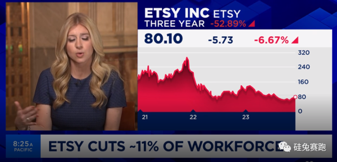 Etsy,纳斯达克上市的美国知名手工制品在线零售平台,12 月 13 日,其 CEO Josh Silverman通过直播的形式通知了工作人员,即将到来圣诞假期的“不幸”:全公司将开始一轮大幅度裁员。预计裁掉的 225 名员工,约占 Etsy 员工总数的 11%。这其中还包括首席营销官Ryan Scott在内的几位高管,遣散费和福利相关的裁员成本估计在 2500-3000 万美元之间,一旦裁员完成,Etsy 的总员工数将降至 1770 人。其公司对外给出的原因是:过去两年商品销售总额基本持平,尽管采取了成本削减措施,但员工开支却不断增加。受裁员消息影响,上周 Etsy 股价持续下跌,市值较之前蒸发约 10 亿美元。