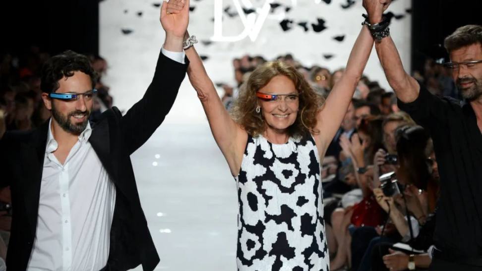 2012 年,谷歌联合创始人谢尔盖·布林以及设计师黛安·冯芙丝汀宝演示 Google Glass