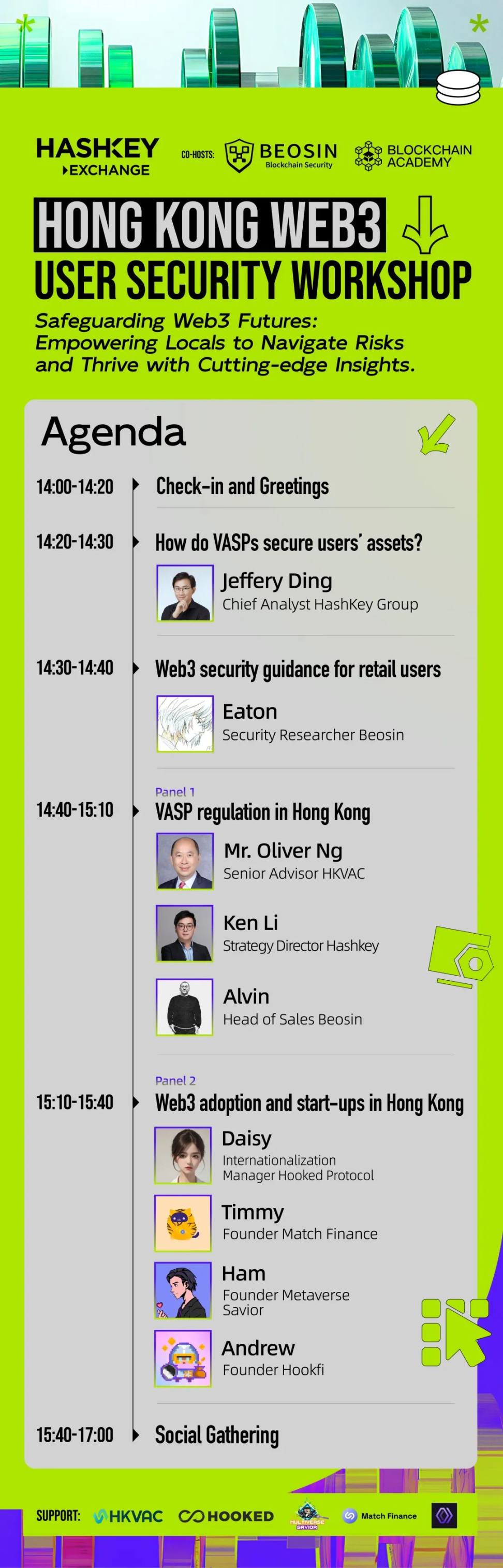 本次活动将邀请一系列专家进行主题演讲,同时还会有一些神秘嘉宾莅临现场与大家进行讨论。HashKey Group 首席分析师Jeffery Ding将进行主题为《How do VASPs secure users’assets》的演讲,他将分享有关虚拟资产服务提供商(VASP)如何确保用户资产安全的见解和经验。Beosin 学院安全研究专家 Eaton将进行主题为《Web3 security guidance for retail users》的演讲,他将向参与者提供有关 Web3 安全的指导和建议,帮助香港 Web3 用户更好地保护自己的数字资产。