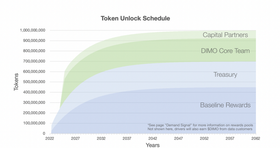 目前流通 194mln(其中包括空投的 70mln, baseline rewards 已经分发的 57mln, 以及 67mln 分配给国库),最初的空投实际上是对 baseline rewards( 理解为挖矿收入 ) 的大规模分发(70mln),剩余 382,491,185DIMO。该池将在 40 年内分发,首年每周向用户发行 1, 00, 1050DIMO,每年减少 15%。从筹码结构来看是较好的。