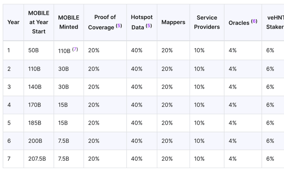 MOBILE 代币通过 5G-CBRS 和 WiFi 热点进行挖矿,既包括数据传输所得,也包括覆盖证明。代币分配 MOBILE 遵循与 HNT 类似的铸币计划,但最大供应量为 230,000,000,000(230B)。在移动网络启动时,预铸了 50B MOBILE 并分配给由 Helium Foundation 管理的网络运营基金。此分配的一部分在创世期间分发给活跃的 Mobile Network 热点。MOBILE 的第一年始于 2022 年 8 月 1 日,第一批代币于 2022 年 8 月 12 日铸造。