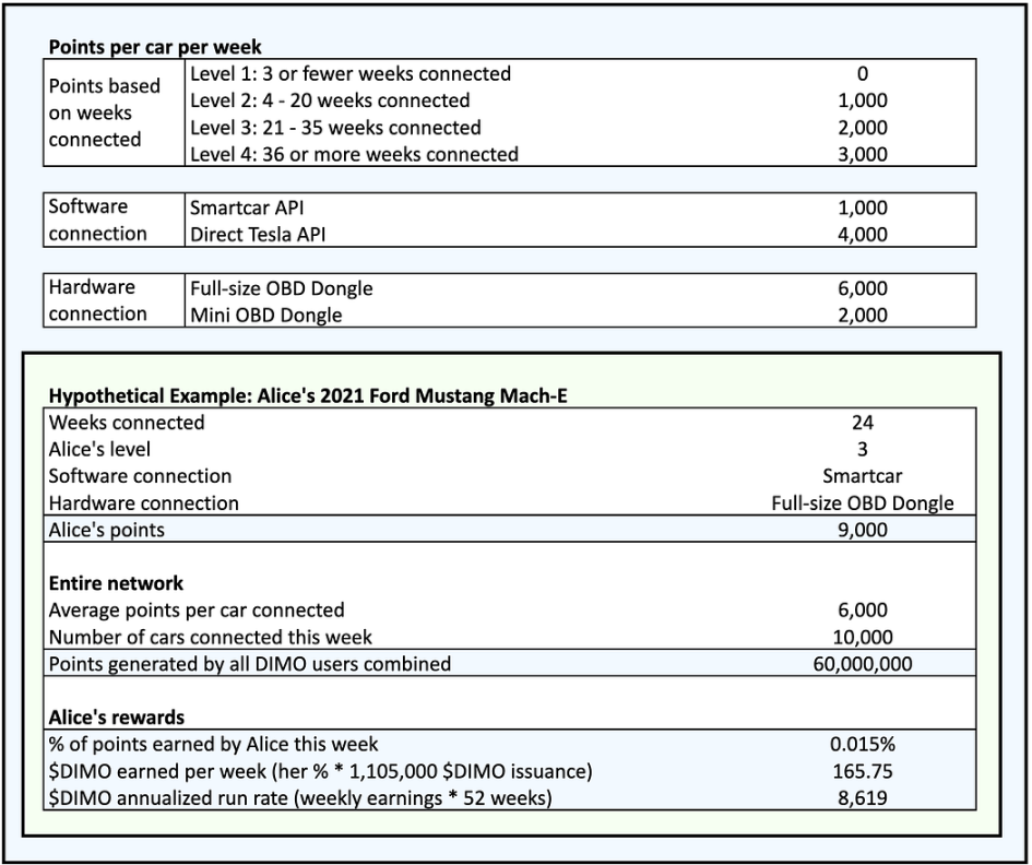 代币分布来看,DIMO 总供应量为 10 亿,baseline rewards 占比 38%,3.8 亿枚 DIMO 将会在 40 年内进行分配,第一年每周向用户发行 1,105,000 DIMO,每个用户获得的挖矿奖励根据下图规则分发,发行量每年减少 15%;Dimo 国库占比 22%,为网络做出贡献的团队和个人可能会以赏金或赠款的形式收到 $DIMO;团队占比 22%,代币分配将受到两年的锁定,然后每月线性解锁,直至三年后全部解锁完毕;投资者占比 8%,代币分配将受到两年的锁定,然后每月线性解锁,直至三年后全部解锁完毕;空投占比 7%;