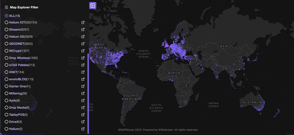 除了 Solana 生态上的 DePin, 其他生态中也有生态和项目发展较成熟的项目,包括上文和 Honey(Hivemapper) 进行对比的 Dimo, IOTX(IOTEX), Streamr(DATA), WIFI Map(WIFI) 等。 从 Depinscan 提供的热点分布图可以看出,Helium 生态(IOT,5G)热点分布最广泛,Helium IOT 有 363k 的设备部署,Helium 5 有 38k, 其次是 Streamr 部署了 83k 设备。