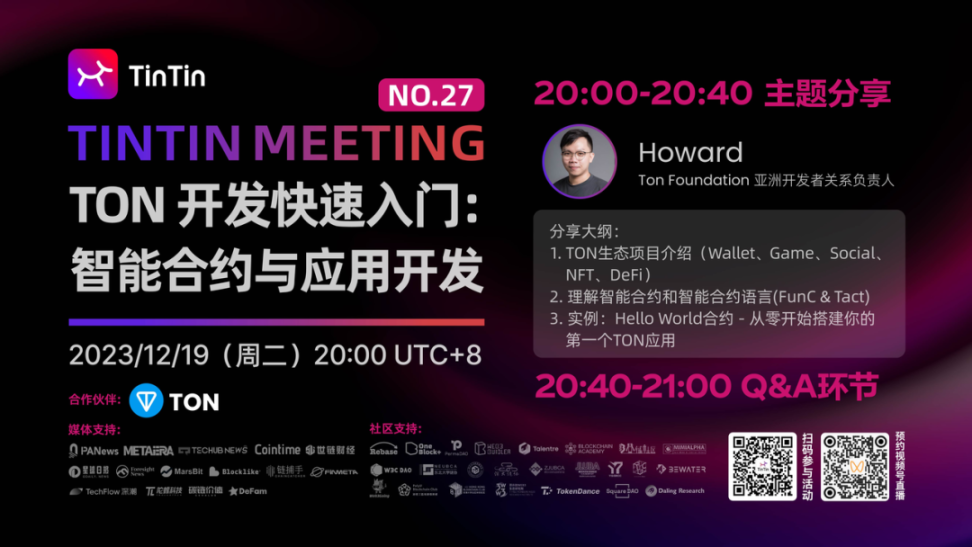 12 月 19 日晚 20:00 举行的第 27 期 TinTinMeeting 活动邀请到了 Ton Foundation 亚洲开发者关系成员 Howard 与关注 TON 生态发展的爱好者们相聚直播间,共同探索 TON 生态项目版图,理解智能合约语言 FunC&Tact,从 0 到 1 搭建第一个 TON 应用。本次线上活动共吸引了近 300 位观众的参与,不少观众还在直播间与嘉宾们近距离交流互动。