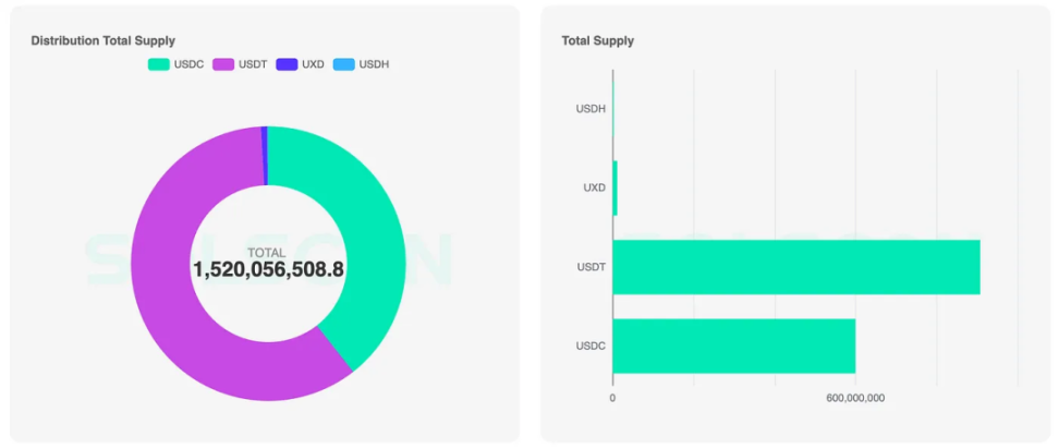 除了网络性能外,资本流入在讨论 Solana 时经常被忽视。目前,有 15 亿美元的稳定币在网络上流通,其中 USDT 占 9.07 亿美元,USDC 占 5.99 亿美元。在稳定币中,Solana 上发行的 USDT 排名第三,仅次于波场和以太坊。尽管只有 5.9 亿美元的流通供应,Circle 已经授权在 Solana 网络上发行 50 亿 USDC,这占到了总 USDC 供应量的近 20%。