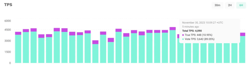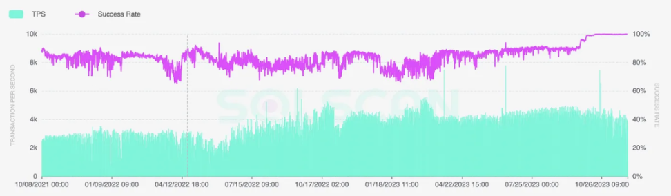 此外,交易成功率也有了显著提高。在 Solana 的初始阶段,有相当多的交易失败,几乎占到 20~30%。然而,在过去的两个月中,交易成功率已经达到了约 99%。此外,平均每秒交易数(TPS)从一般的 3000 增加到了 4000。