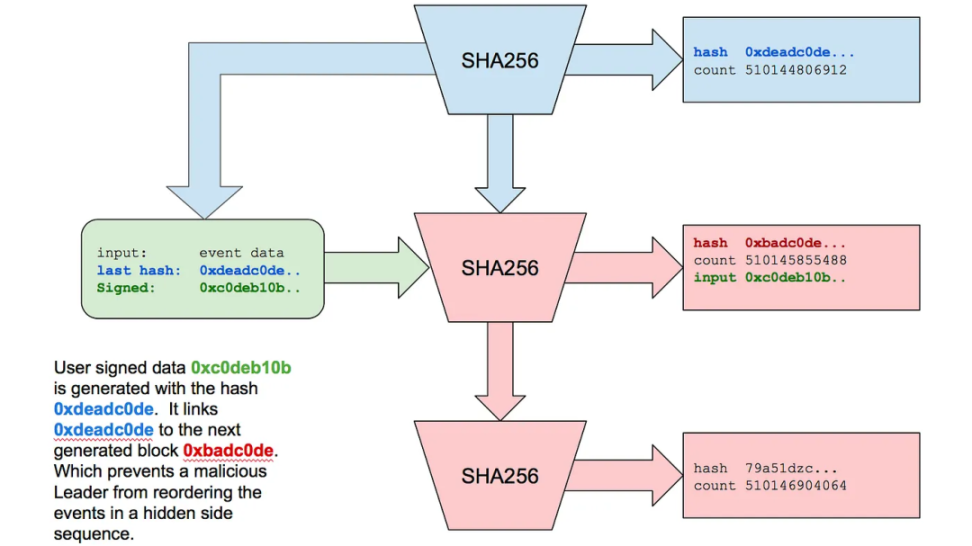 本质上,PoH 是一种专门的可验证延迟函数(VDF),可以处理高频计算。对于不熟悉 VDF 的人来说,它是一个需要特定数量的顺序步骤来进行评估的函数,并且其结果可以被有效验证。VDF 通常用于测量持续时间。在 PoH 的情况下,其哈希链包括应用程序观察到的任何数据的哈希,确保数据存在于后续的哈希之前。VDF 的一个重要特征是其能够将大输入转换为固定输出。