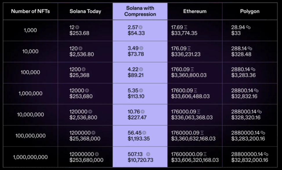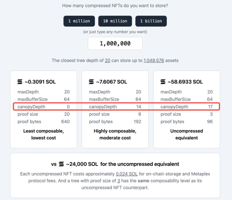 当我们将这项技术应用于 NFT 时,将产生压缩的 NFT,这可以显著降低成本,特别是当我们需要为一个项目铸造数百万个 NFT 时。如下所示,使用状态压缩铸造 100 万个 NFT 的成本仅为 5.35 SOL,而在升级之前则为 12000 SOL。