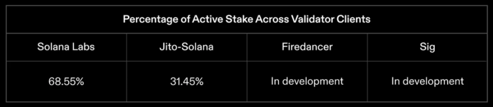 目前,正在进行四种不同类型的客户端渠道,旨在提高客户端多样性。然而,大多数 Solana 验证人仍在使用 Labs 客户端,这在出现错误时可能导致网络中断的风险。Jito Labs 开发了一个 MEV 分支,可以让搜索者(如套利机器人)向验证人提供补偿以包含他们的交易。这种配置减少了垃圾邮件,并确保验证人从大多数 MEV 机会中受益。令人惊讶的是,截至 2023 年 10 月,超过 31% 的 Solana 验证人正在使用 Jito Labs 客户端。
